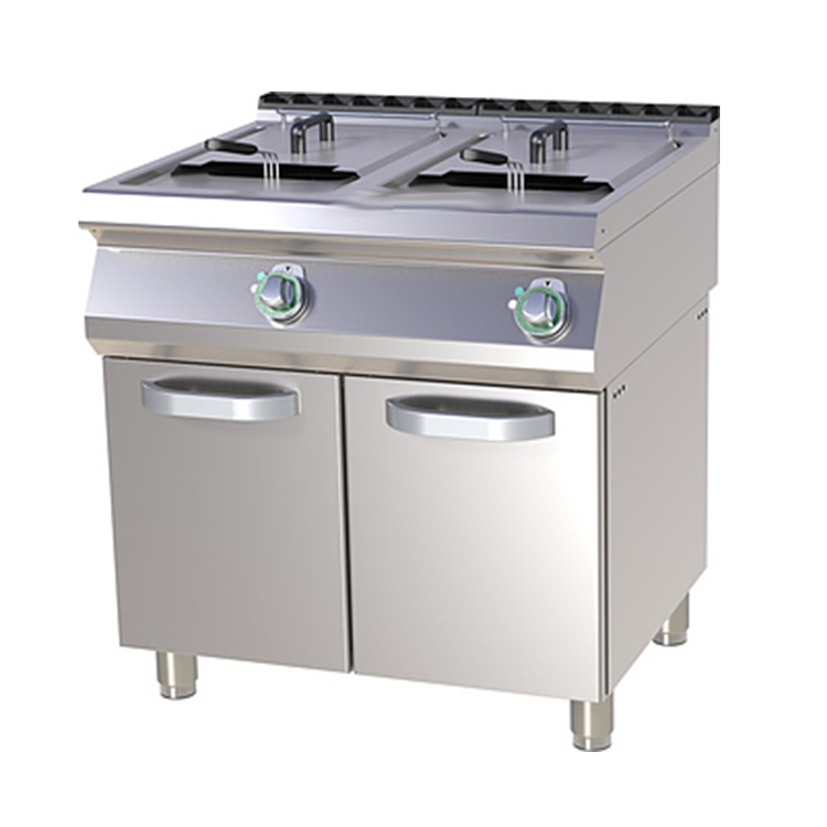Фритюрница Azimut FE 780/13 E электрическая напольная, на закрытом стенде с 2 дверцами имеет электромеханическую панель управления, сливные краны, холодную зону, ТЭНы из нержавеющей стали.