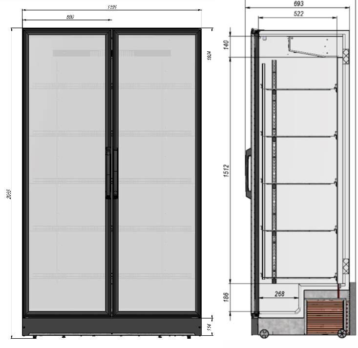 - Благодаря стеклянным распашным дверям и внутренней подсветке, шкаф идеально подходит для демонстрации различных продуктов и напитков, привлекая внимание покупателей.